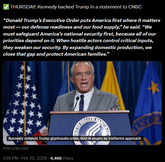 Hypocrisy alert: RFK Jr now says he supports the president’s decision on glyphosate.