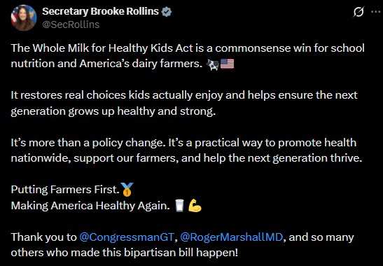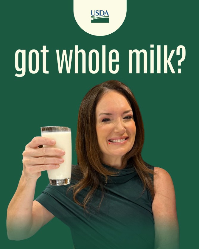 Here is USDA Secretary Brooke Rollins doing a version of the dairy industry’s milk mustache campaign celebrating the reintroduction of whole milk into schools.