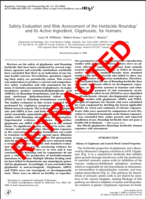 And here’s what Retraction Watch has to say: “Glyphosate safety article retracted eight years after Monsanto ghostwriting revealed in court”