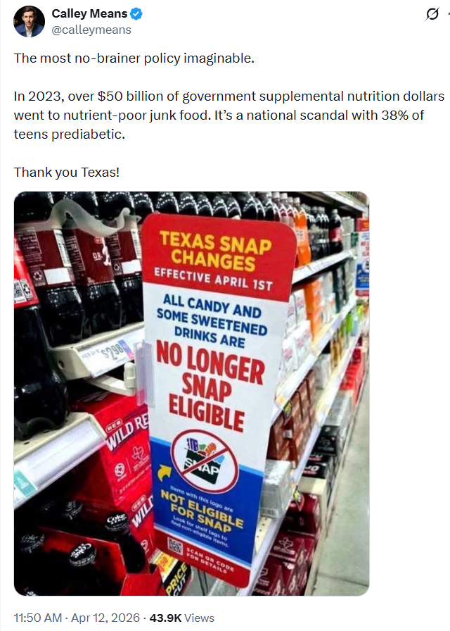 - It encouraged states to pass SNAP purchase restrictions, framed as health interventions—see Calley Means’ post below—but actually intended to discourage participation. These further stigmatize participants and imposre costly compliance burdens on retailers.