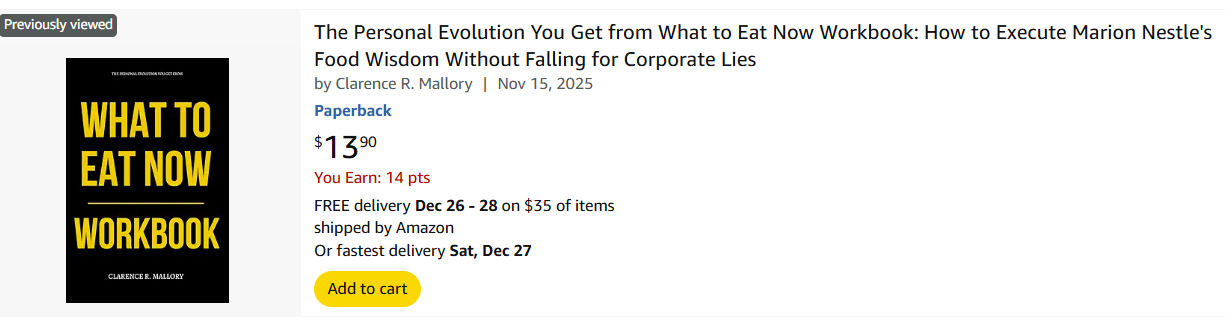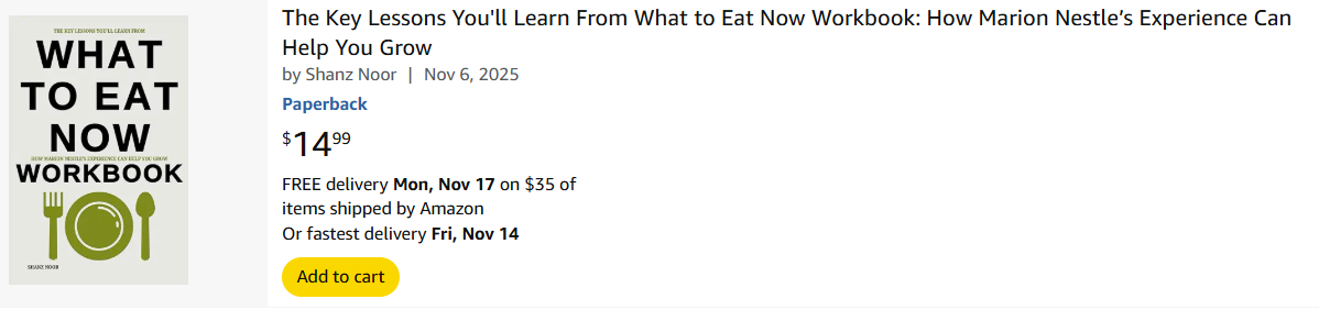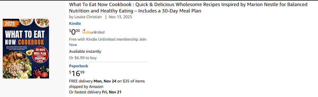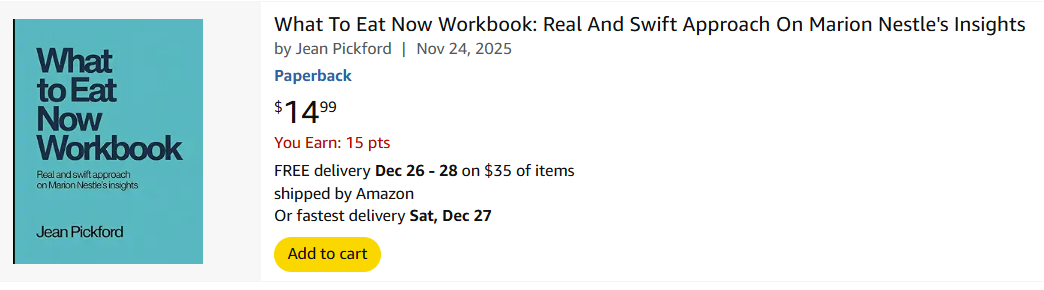 I don’t know whether to be appalled or flattered.  This starts out by saying my book is “a powerful compass for anyone navigating today’s overwhelming food environment.”  It provides a not-bad summary (in what reads like AI-speak) with what I presume are AI-driven key lessons, suggested “life-changing” activities, and self-reflection questions for the first 16 chapters of my book.   Example of life-changing activity: “Commit to shopping with a list and sticking to it for a month.”  Example of self-reflection question: “When was the last time I checked a label for truth, not slogans.”  Like much AI-generated content, this is banal but not terrible.  But it only covers a third of the book.  This one is still on Amazon, but with no consumer ratings.