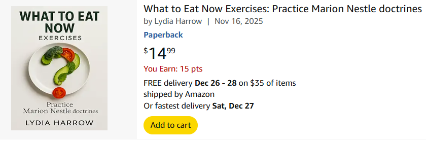 I didn’t know I had doctrines.  Oh well.  Lydia Harrow says “This work is a creative interpretive exercise based on the teachings and research of Marion Nestle.  It is not affiliated with, endorsed by, or authorized by Marion Nestle or her representatives.”  It reads like an AI summary: “When Marion Nestle began her work in food studies, she confronted a world that was drowning in marketing but starving for truth [p. 4]…Marion Nestle’s doctrines remind us that food literacy is not an academic pursuit but a lived practice.  It is cultivated in daily choices….[p. 13]” and so on for 82 pages.